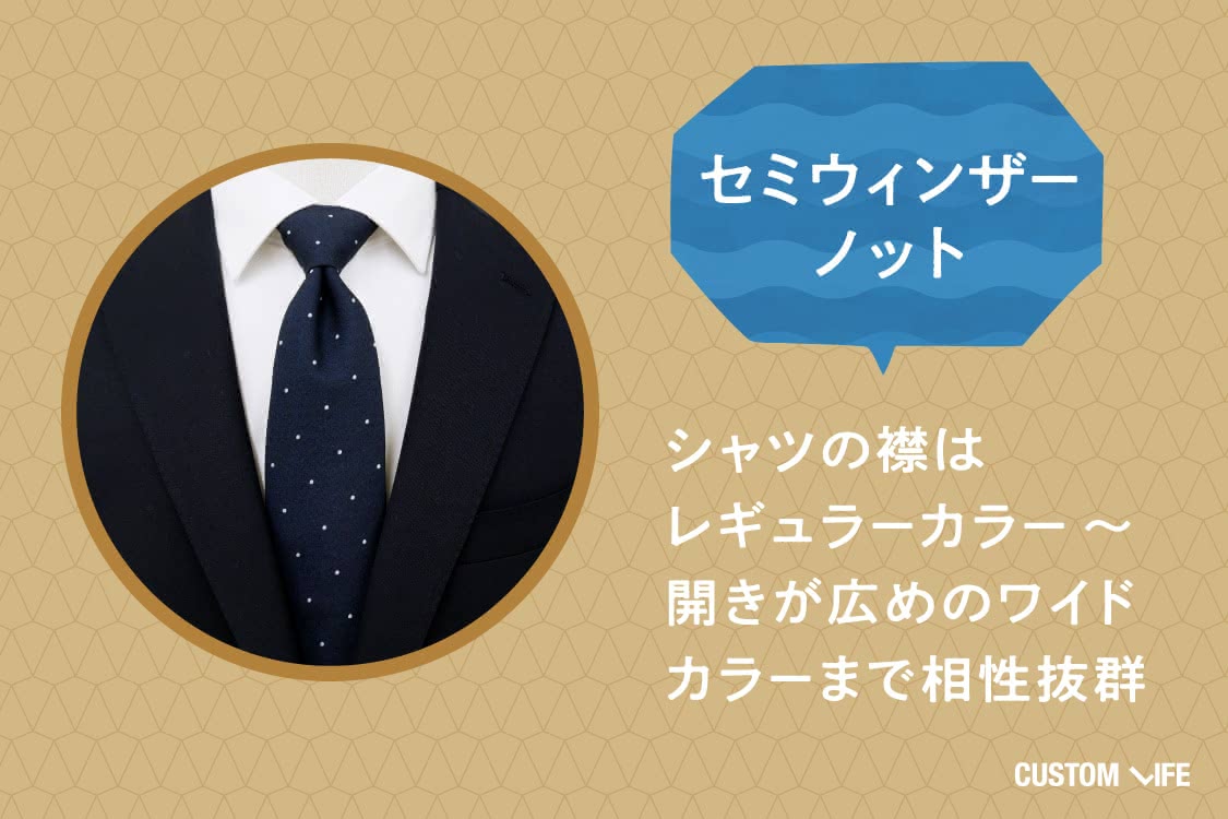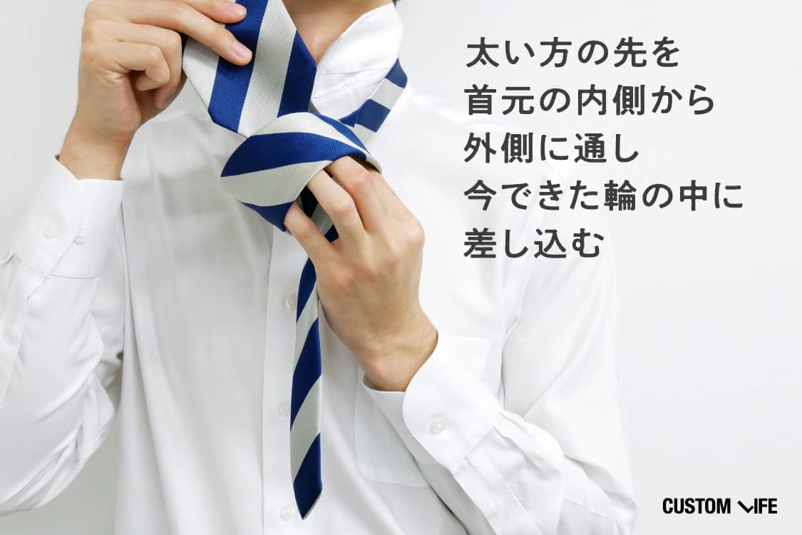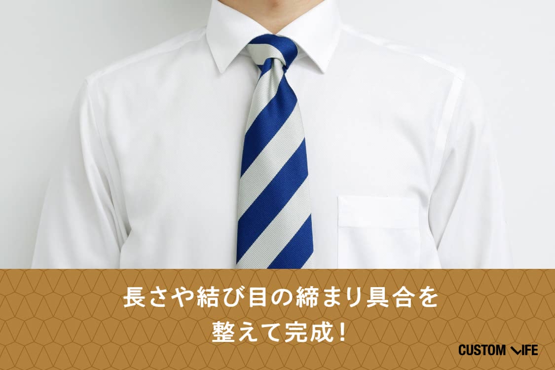 この結び方は、プレーンノットよりもさりげなくおしゃれで、 普段のビジネスシーンから営業先でも使えますよ。