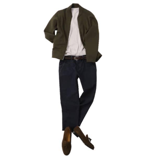 ニット×スウェードの相性は抜群。足元をスニーカーからスウェードローファーに変えるだけで一気に品があるコーデに格上げ。