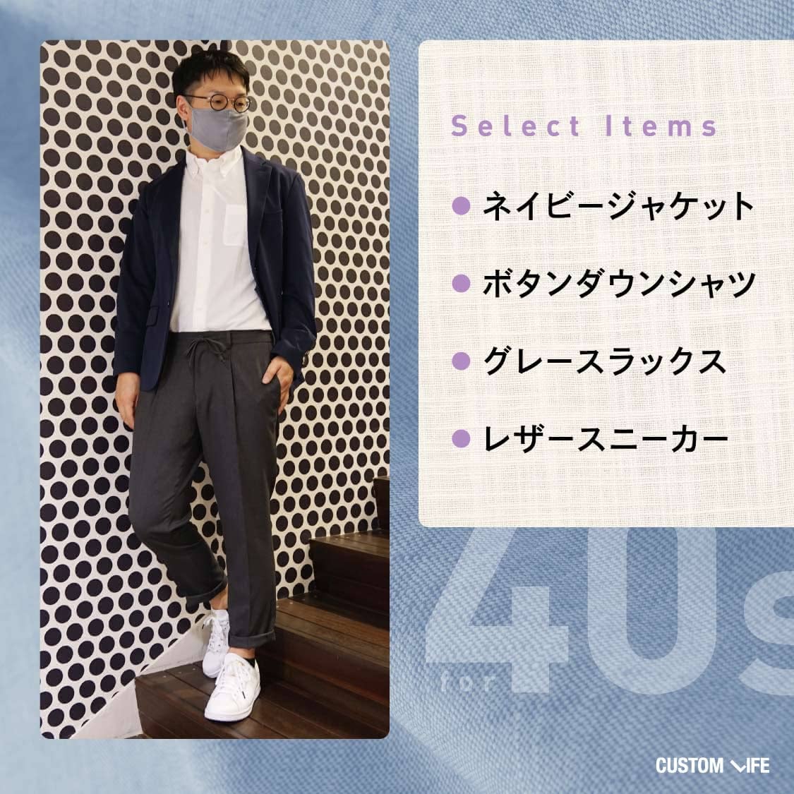 …ネイビージャケット、グレースラックスなどが着回しやすい定番アイテム